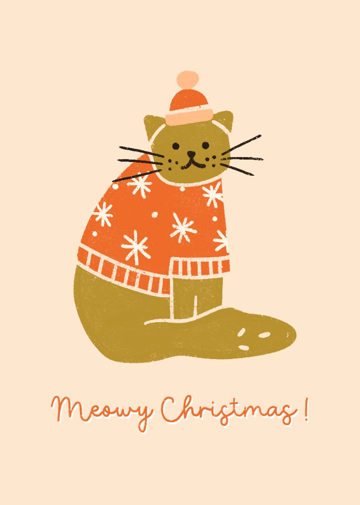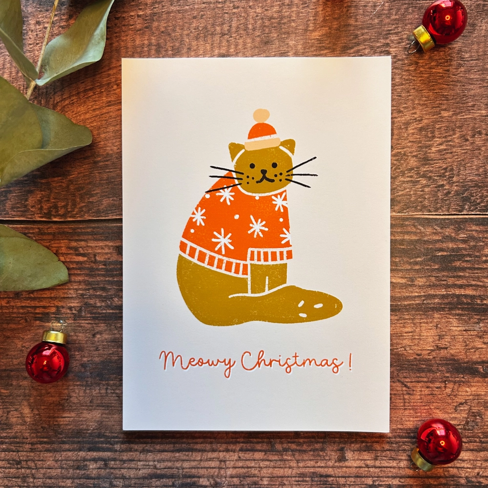 Comment résister à ce chat et son pull de Noël ? Une carte colorée et réconfortante pour vos proches amoureux de chats.