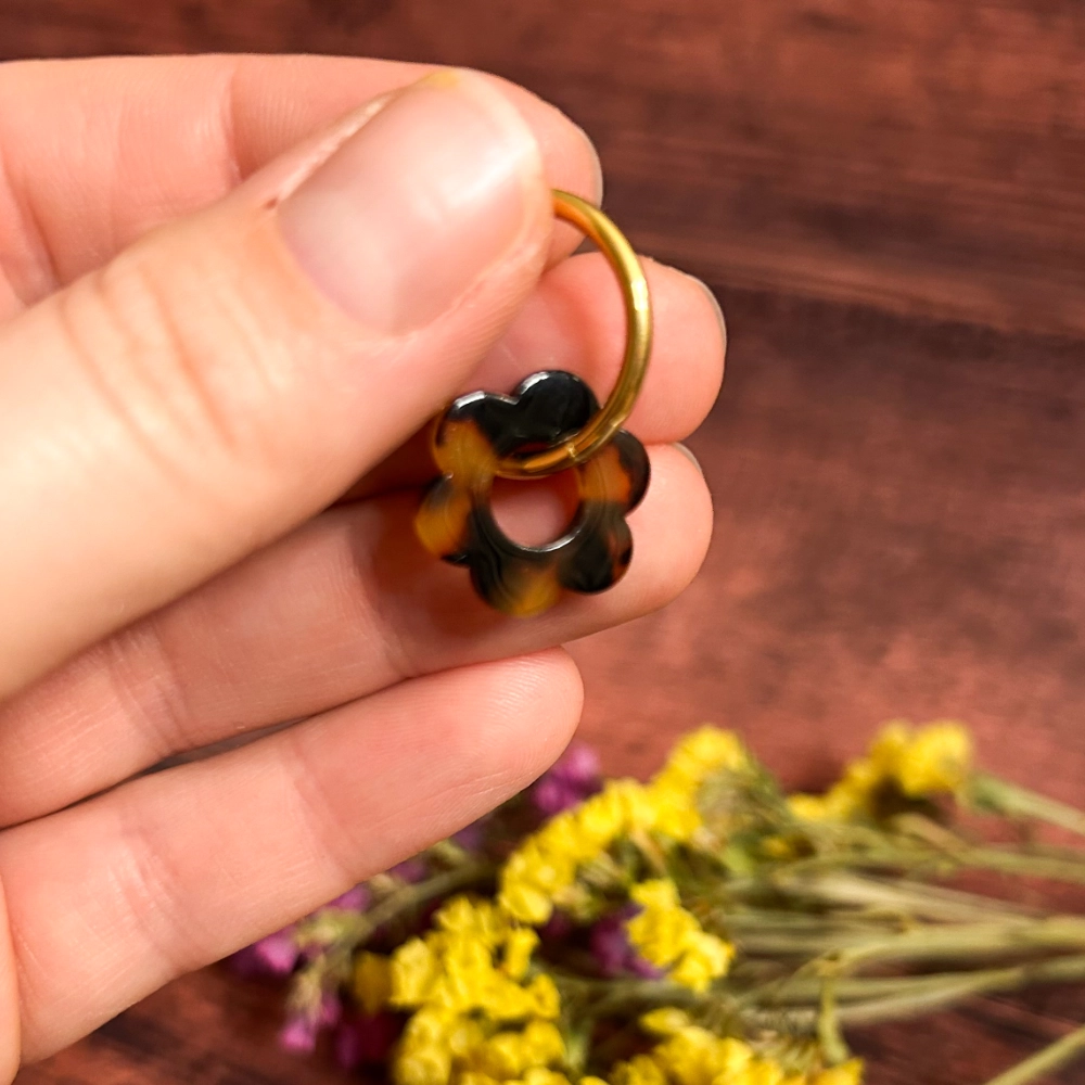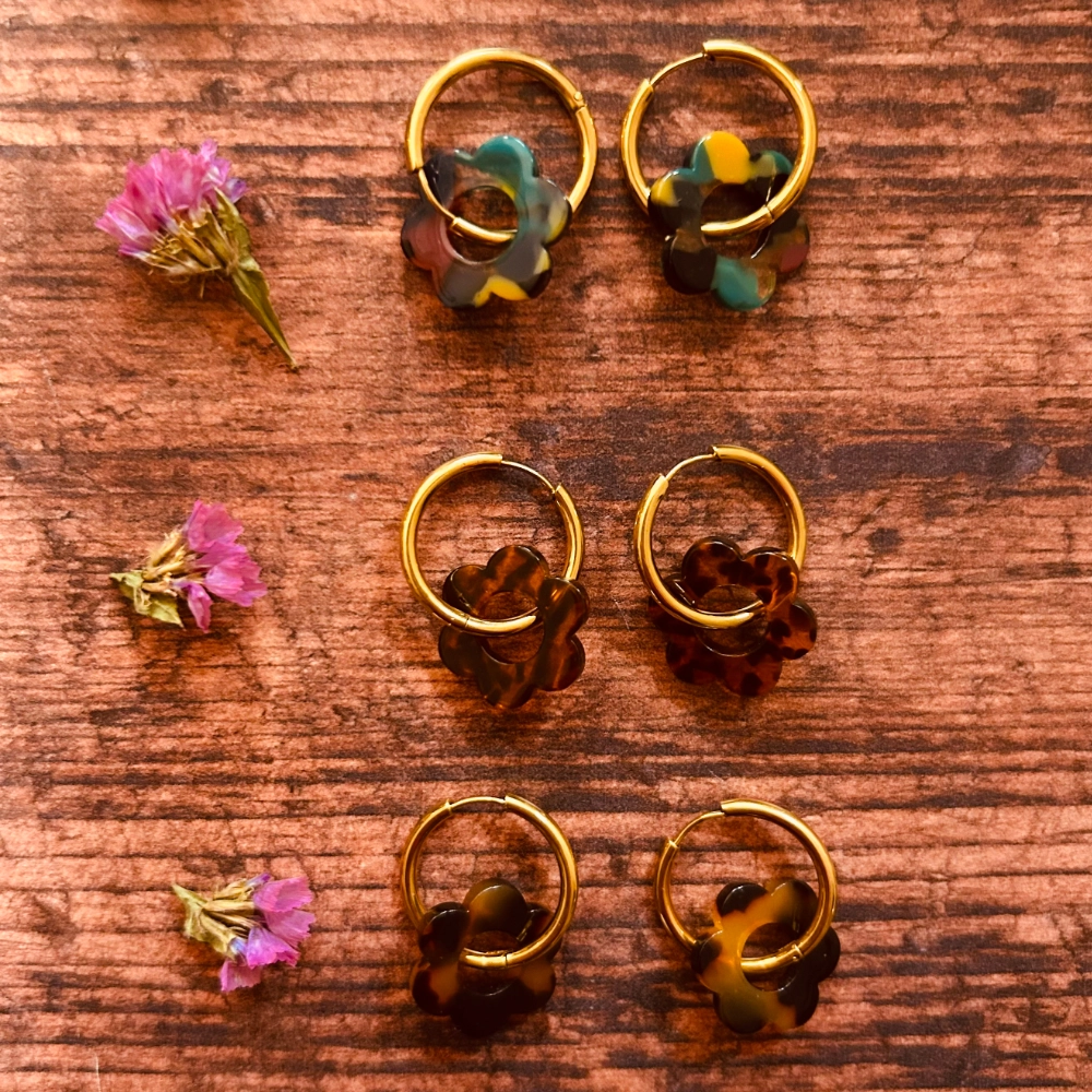 Boucles d’oreilles pendantes style créoles en acier inoxydable doré et pendentif fleur en acétate.